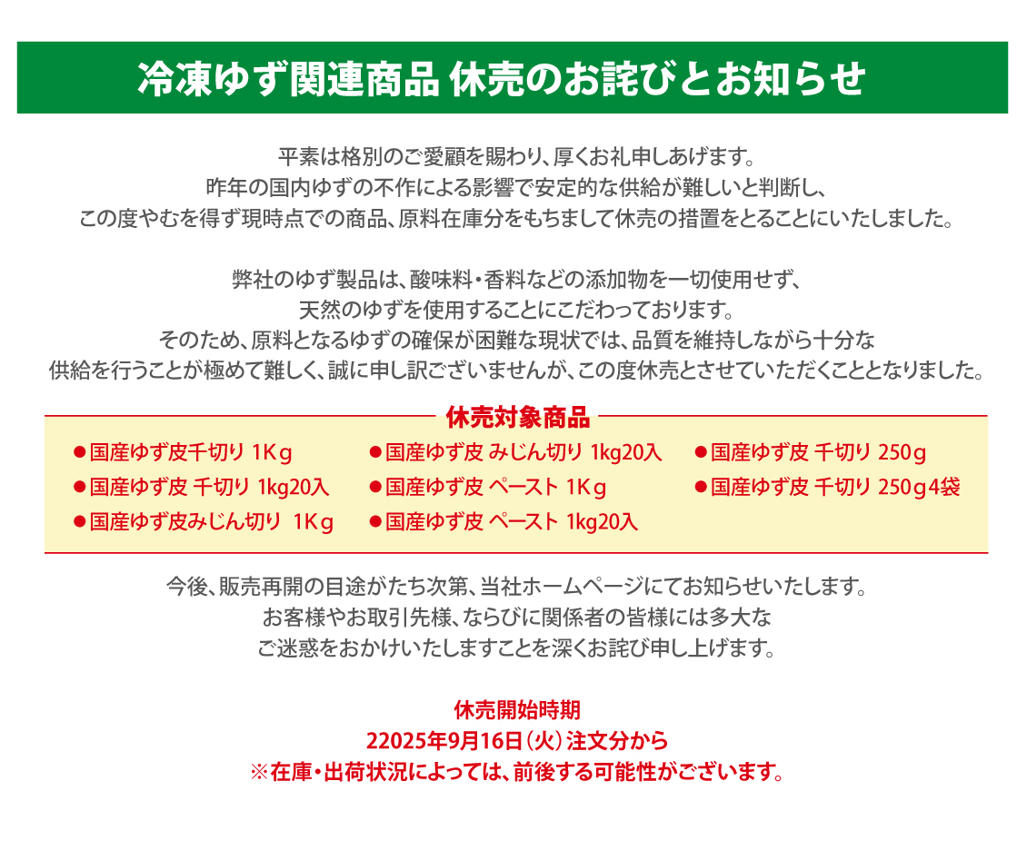 【重要】2026年2月価格改定のお知らせ ≪詳しくはこちら≫ TOP お知らせ 2025年9月 冷凍ゆず製品休売のお知らせ お知らせ 2025年9月 冷凍ゆず製品休売のお知らせ 2025.08.22 11:57 お知らせ